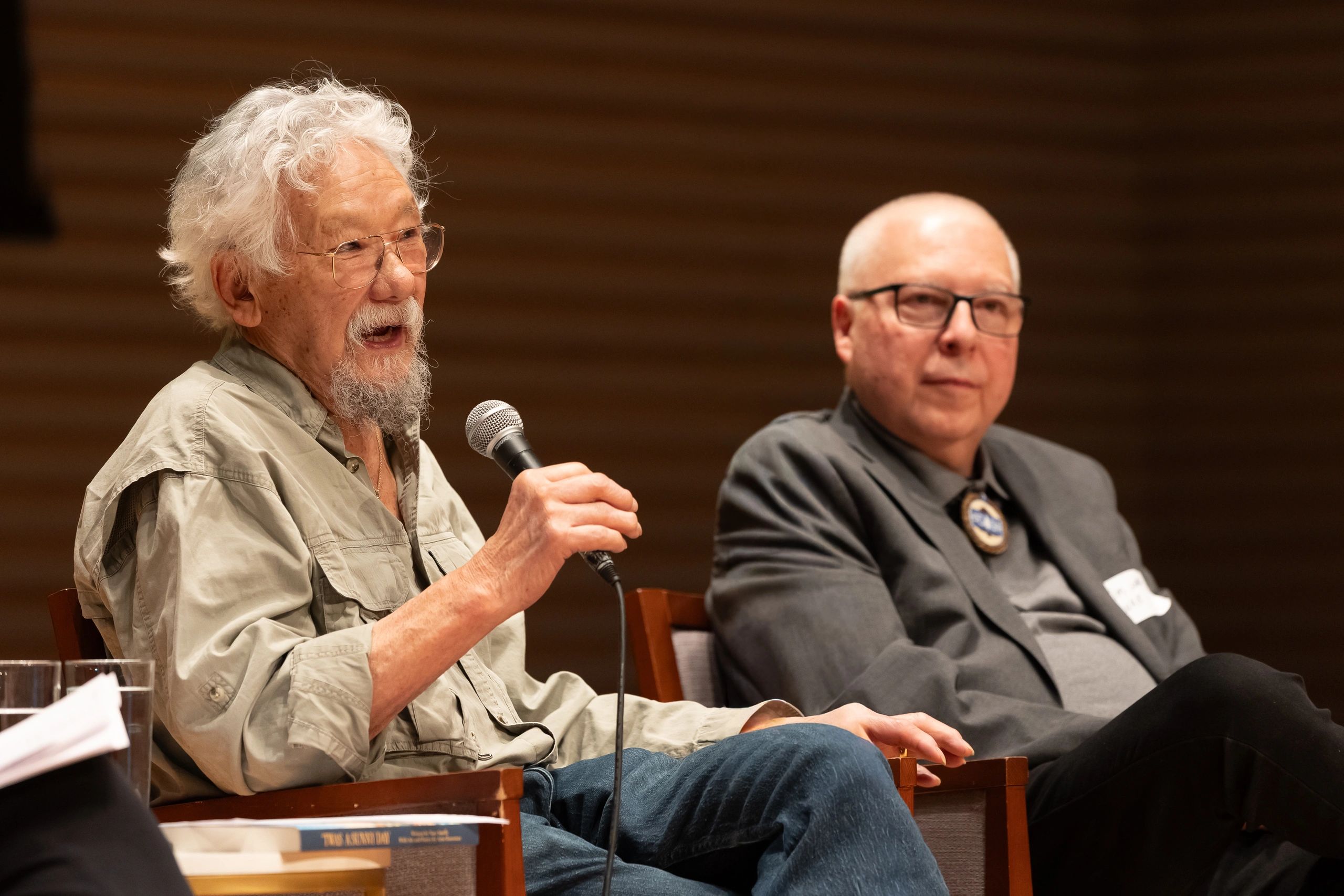 Dr. David Suzuki with Niagara Academy for Indigenous Relations President Tim Johnson at the Stronger Together program in St. Catharines. (photo by Alex Heidbuechel)